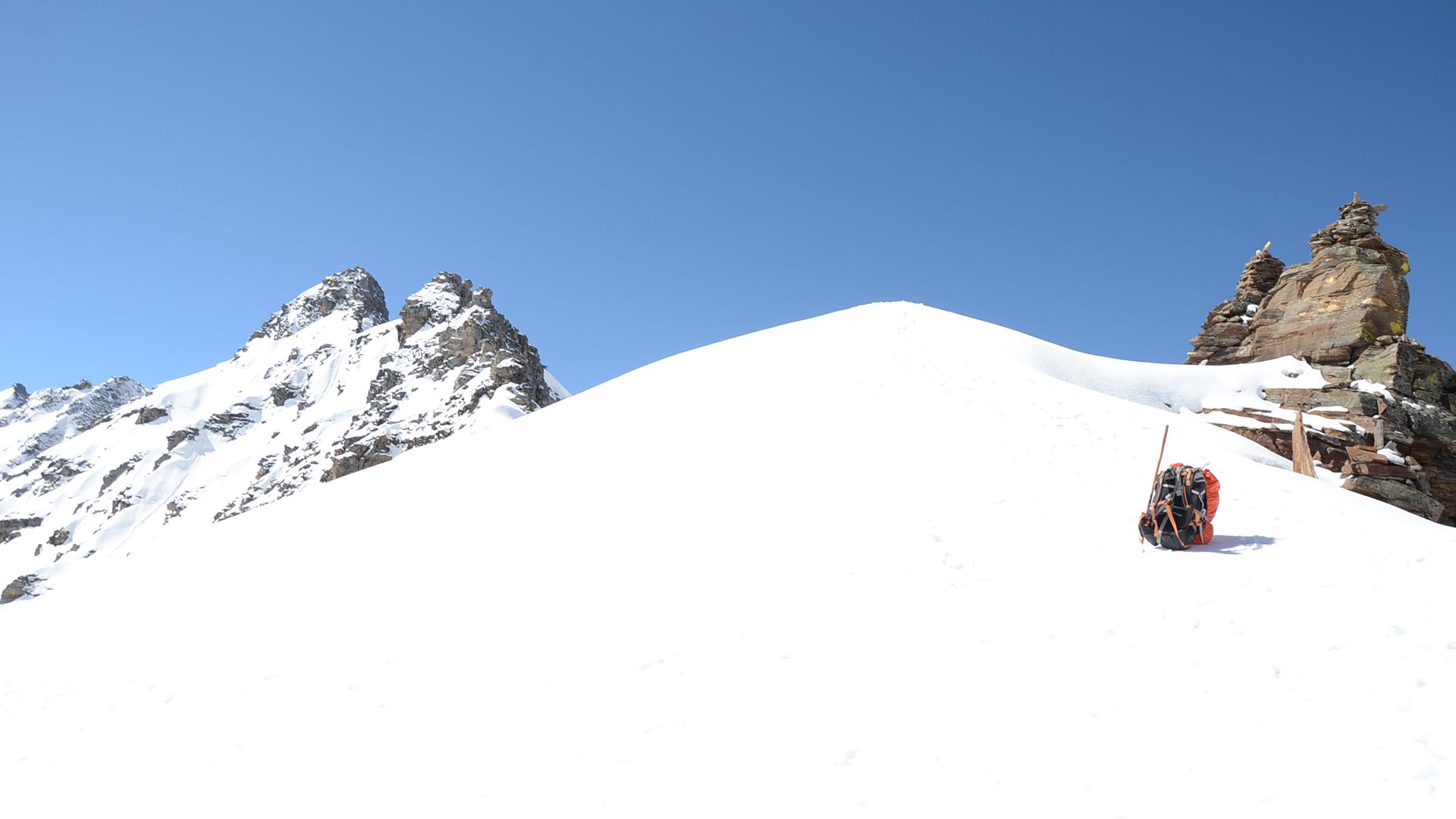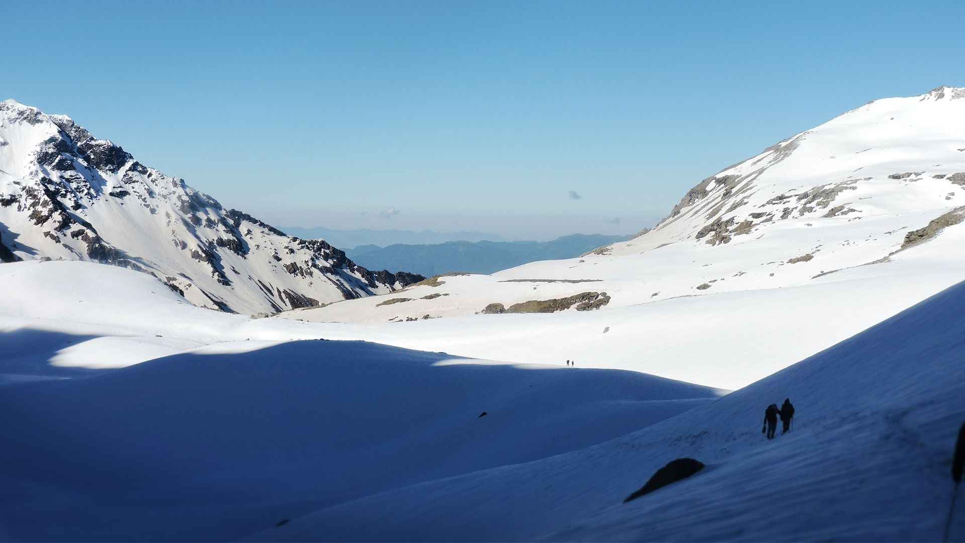 Rupin Pass is a high altitude pass across the Himalaya mountain range in state of Himachal Pradesh, India. It lies on a traditional shepherd and hiking route which starts from Dhaula in Uttarakhand and ends in Sangla in Himachal Pradesh. The path itself is located across mostly uninhabited areas in the Himalayan ranges above sea level. Rupin Pass trek consists of trails dug out of rock faces and wooden bridges, cut through deep dark folds in the mountain, glaciers and icy slopes, and over snow fields. Along the way there are white Rhododendrons and expanse of green meadows.